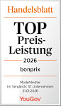 Erneut ausgezeichnet! Nach mehr als 900.000 Interviews mit rund 872 Markenbeurteilungen zeichnet das Handelsblatt die Preis-Leistung von bonprix mit einer TOP-Bewertung in der Kategorie „Modehändler“ aus.