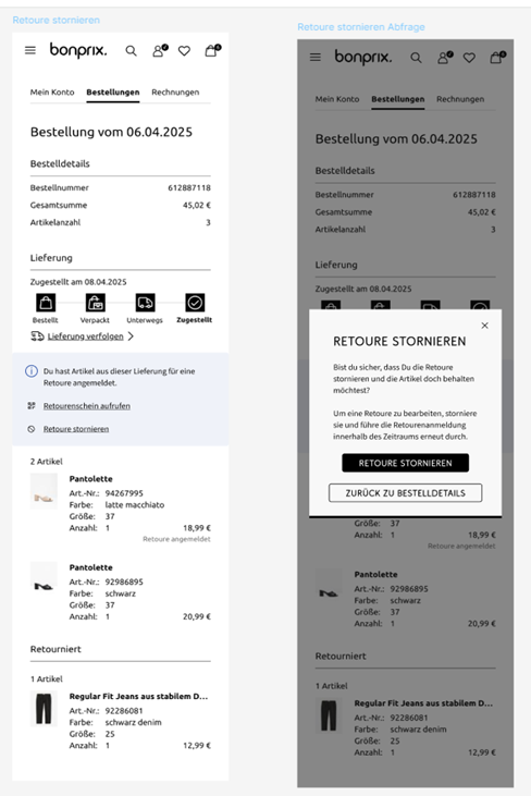 Retouren-Label: In den meisten Fällen findest Du kein Retouren-Label im Paket. Du meldest Deine Retoure einfach selbst in "Mein Konto" an und erhältst sofort ein Retouren-Label. Eine ausführliche Schritt-für-Schritt-Anleitung findest Du unter dem Punkt "Neuer Retourenservice -papierlos, kostenfrei, online" auf dieser Seite.