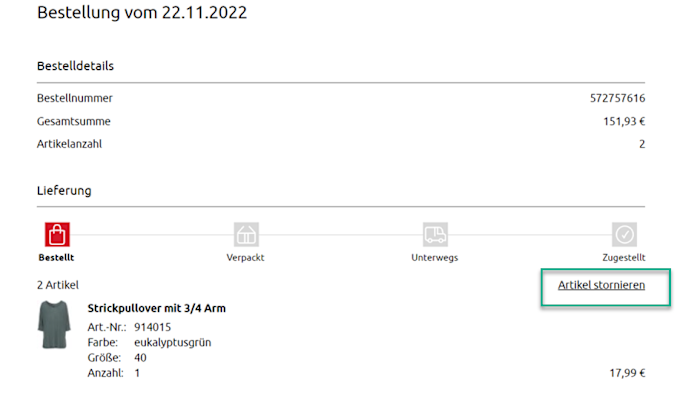 Beispielbild im Mein Konto Bereich „Artikel stornieren“: